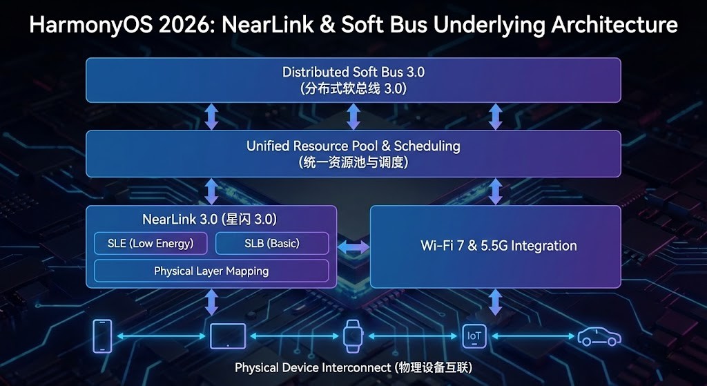 在传统协议里,设备 A 连接设备 B 需要复杂的握手。2026 年的软总线实现了**“原子化对等网络”**。