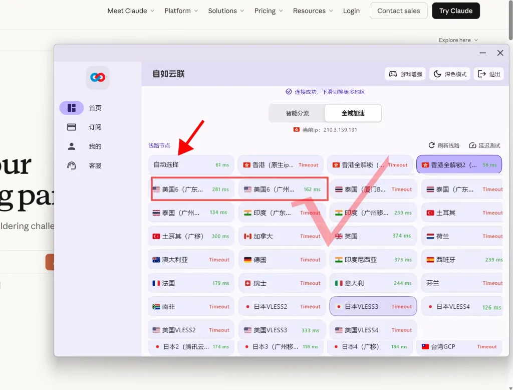 Timeout,先点击“自动选择”然后点击右上角的 “刷新线路”和“延迟测试”直到变成绿色的毫秒数字再连接。必须看到线路后面显示的是绿色的延迟数字(如 162ms),这才是真正连通的状态
