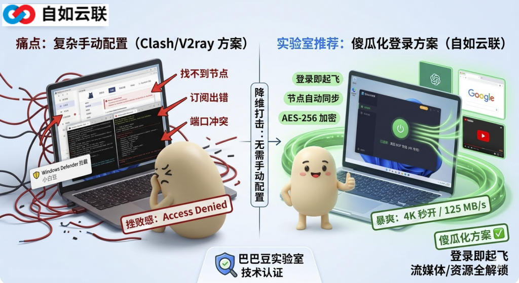 在传统方案中,小白用户常被导向 Clash、V2ray 等内核软件。巴巴豆实验室经过深度测试后发现,这类软件对非技术背景用户极不友好: